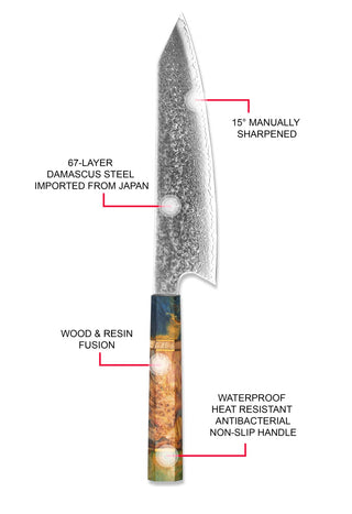 - Chef de 8,5 pouces, bouton 8 pouces, Kiritsuke de 8 pouces, options de Santoku de 7 pouces et 7 pouces.